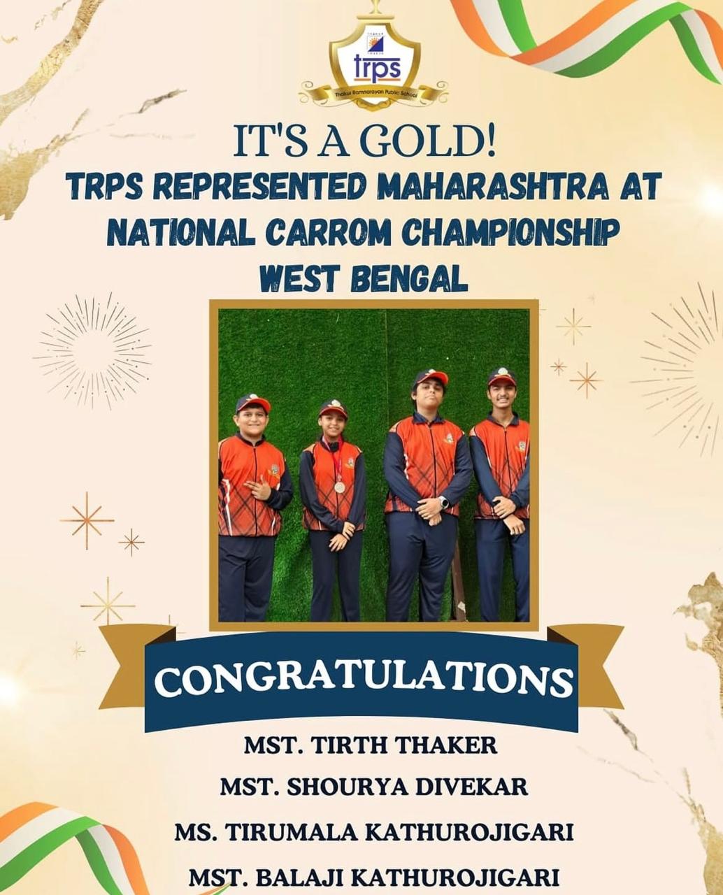 Our champions made us proud by representing Maharashtra at the National Carrom Championship in West Bengal and bringing home the Gold! Congratulations to: Coach Mr. Royal Dias, Mst.Tirth Thaker, Mst.Balaji Kathurojigari, Mst.Shourya Divekar and Ms.Tirumala Kathurojigari Your dedication, focus, and passion have shined bright-TRPS beams with pride!
